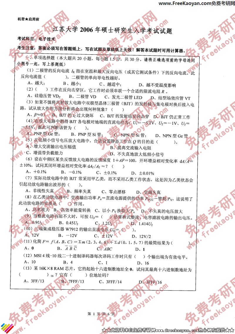 江苏大学2006年考研真题-电子技术