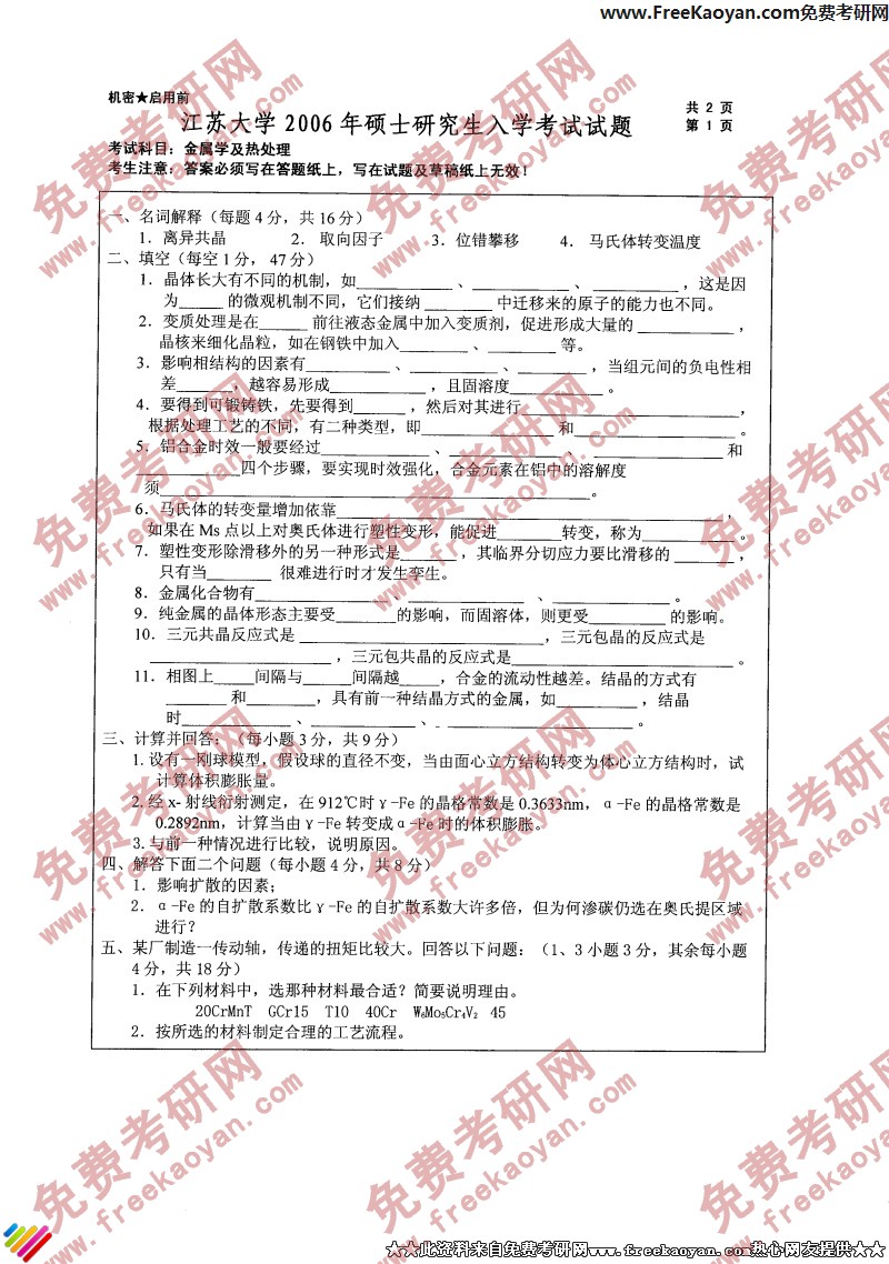 专业课考研经验 本站小编 FreeKaoyan 2018-01-22江苏大学2006年考研真题-金属学