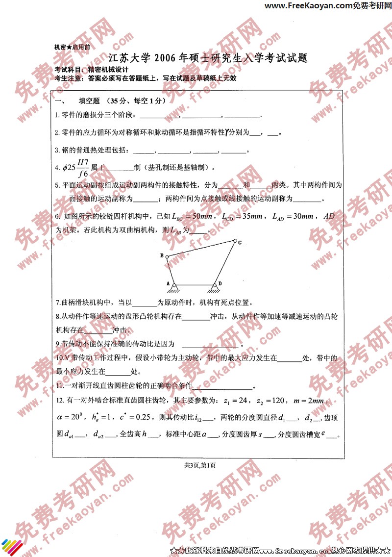 专业课考研经验 本站小编 FreeKaoyan 2018-01-22江苏大学2006年考研真题-机构力学