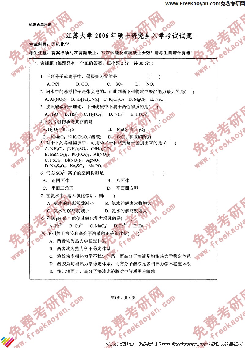 江苏大学2006年考研真题-无机化学