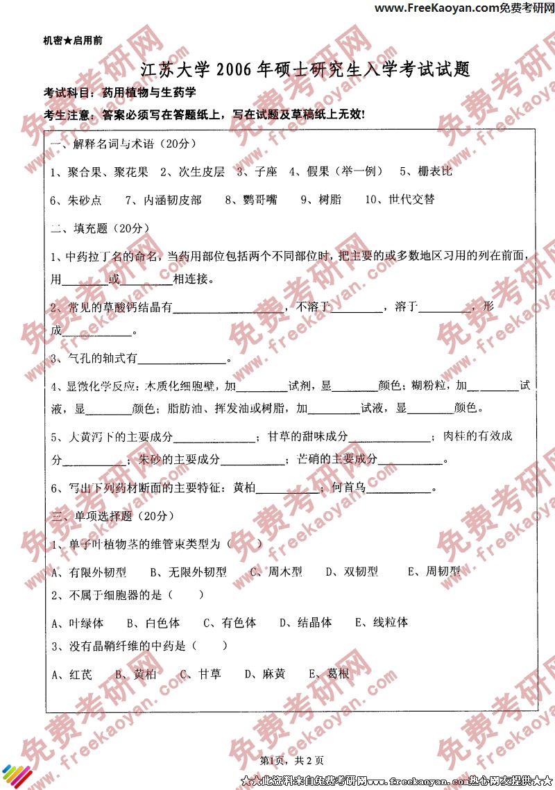 专业课考研经验 本站小编 FreeKaoyan 2018-01-22江苏大学2006年考研真题-天然药物化学