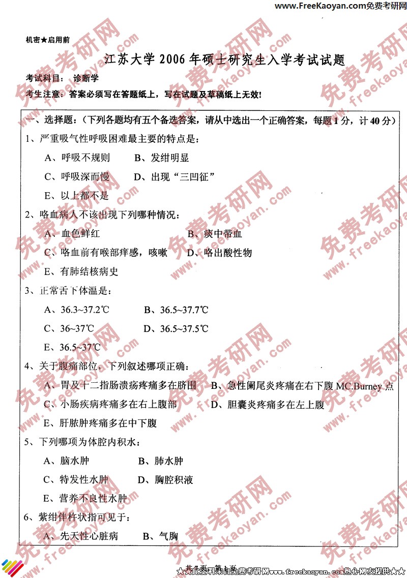 江苏大学2006年考研真题-诊断学