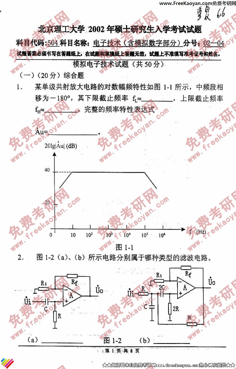 北京理工大学2002年考研真题-电子技术(含模拟数字部分)