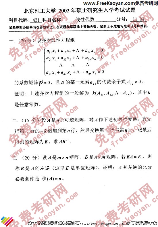 专业课考研经验 本站小编 FreeKaoyan 2018-01-22北京理工大学2000年考研真题-线性代数