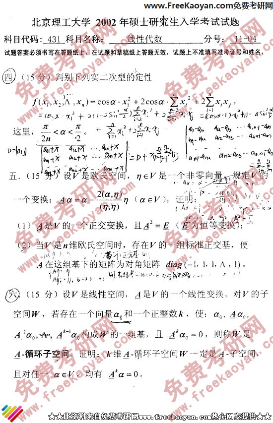 专业课考研经验 本站小编 FreeKaoyan 2018-01-22北京理工大学2000年考研真题-线性代数