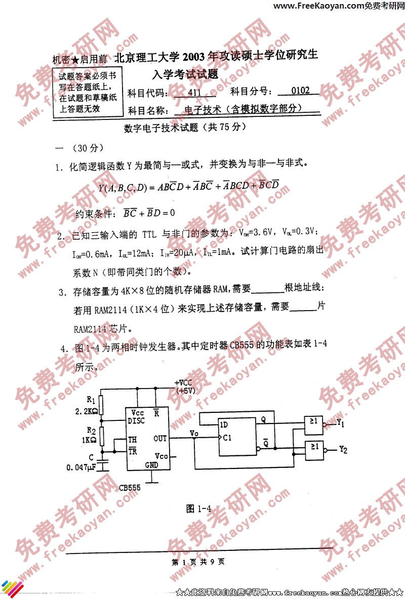 北京理工大学2003年考研真题-电子技术(含模拟数字部分)