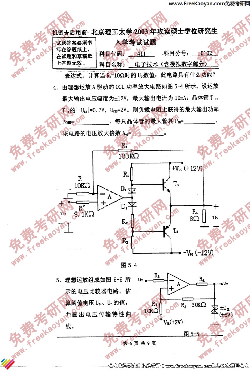 北京理工大学2003年考研真题-电子技术(含模拟数字部分)(6)