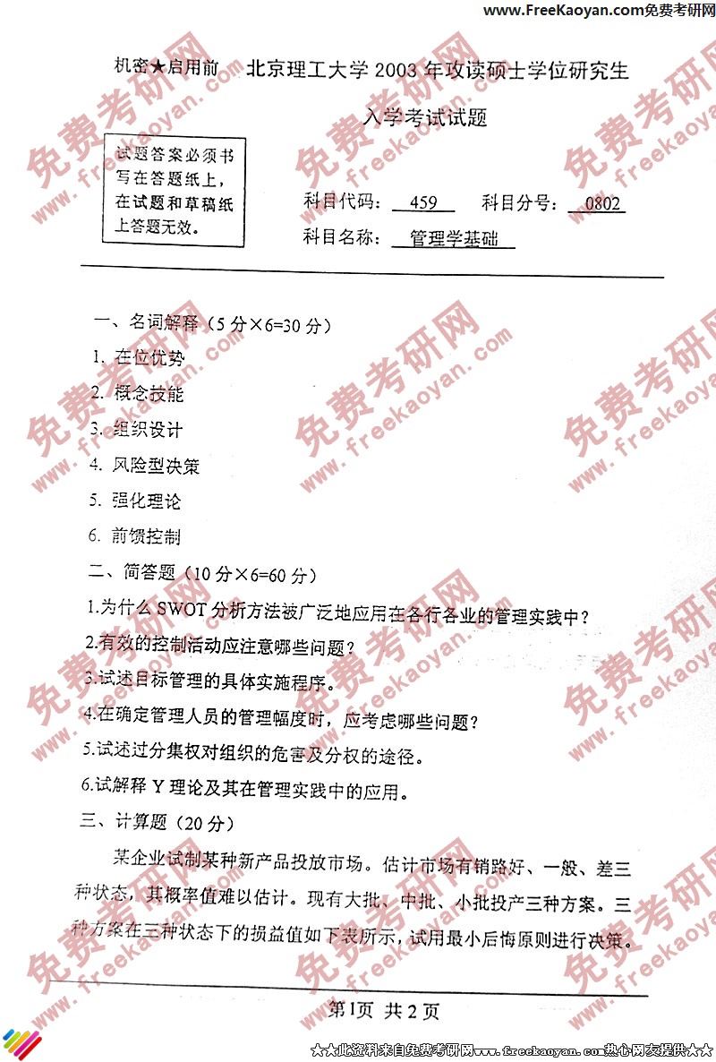 专业课考研经验 本站小编 FreeKaoyan 2018-01-22北京理工大学2003年考研真题-高等代数