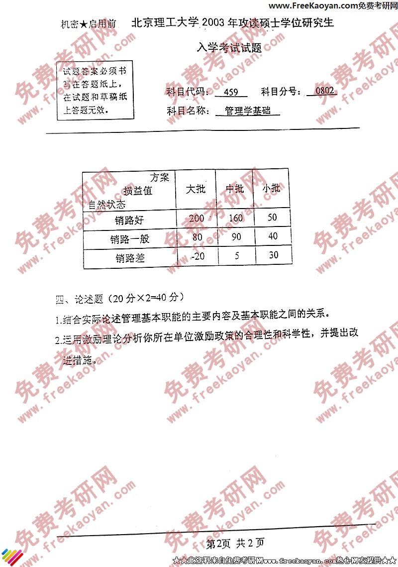 北京理工大学2003年考研真题-管理学基础(2)