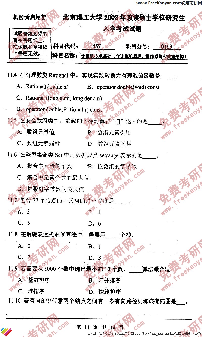 北京理工大学2003年考研真题-计算机技术基础(含计算机组成原理、操作系统和数据结构)(11)