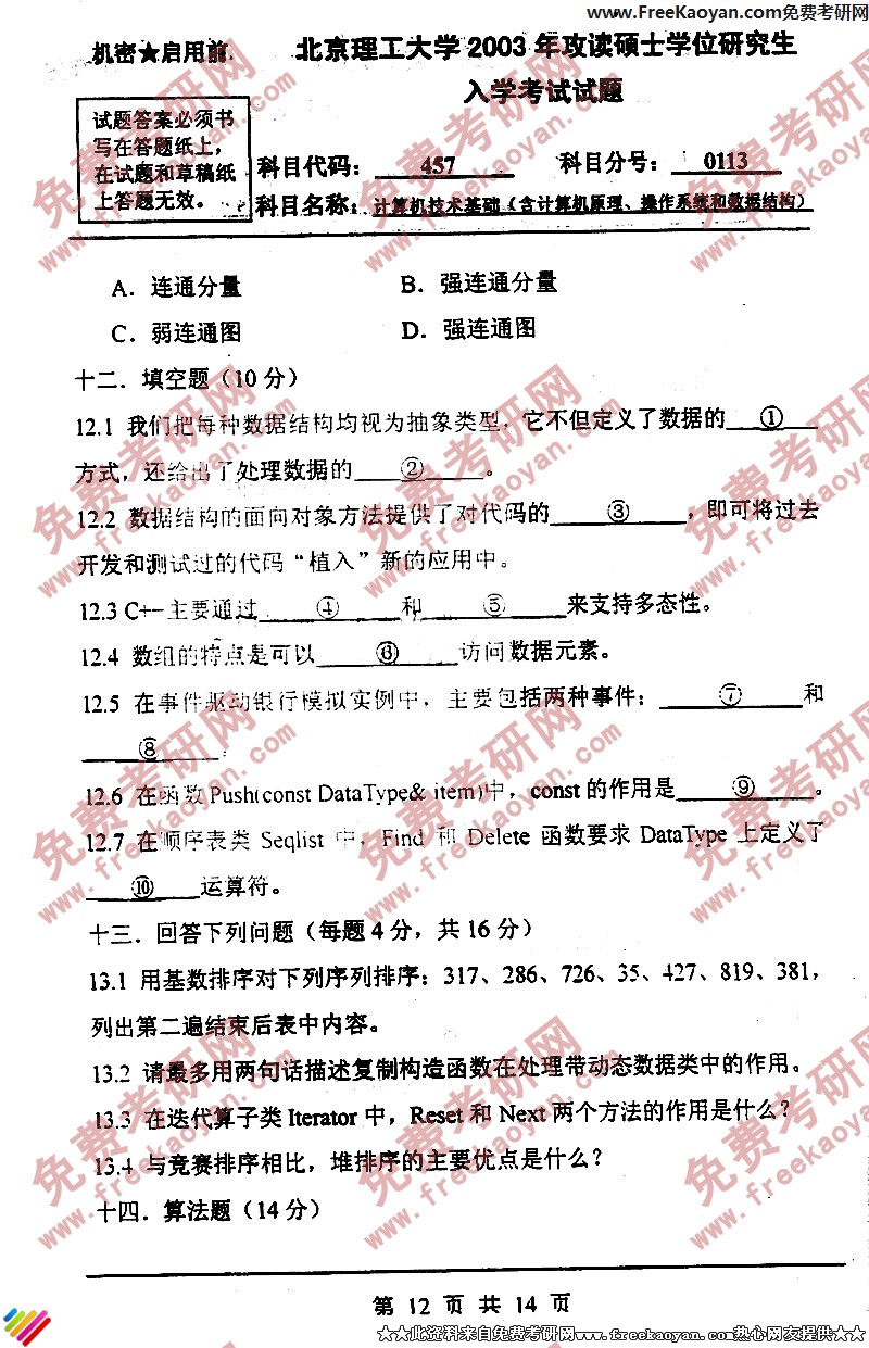 北京理工大学2003年考研真题-计算机技术基础(含计算机组成原理、操作系统和数据结构)(12)