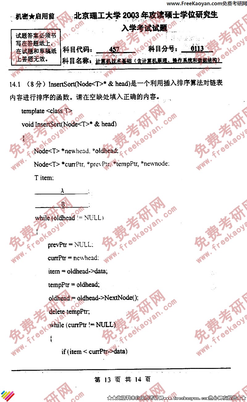 北京理工大学2003年考研真题-计算机技术基础(含计算机组成原理、操作系统和数据结构)(13)