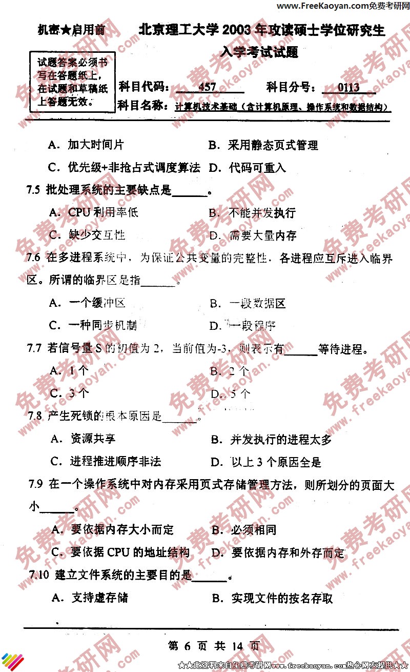 北京理工大学2003年考研真题-计算机技术基础(含计算机组成原理、操作系统和数据结构)(6)