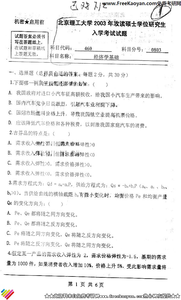 专业课考研经验 本站小编 FreeKaoyan 2018-01-22北京理工大学2003年考研真题-计算机技术基础(含计算机组成原理、操作系统和数据结构)