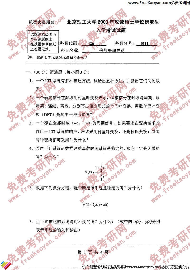 专业课考研经验 本站小编 FreeKaoyan 2018-01-22北京理工大学2001年考研真题-信号与系统