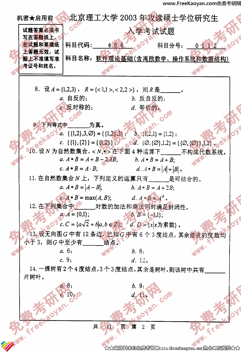 专业课考研经验 本站小编 FreeKaoyan 2018-01-22北京理工大学2003年考研真题-计算机技术基础(含计算机组成原理、操作系统和数据结构)