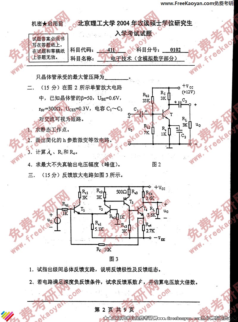 北京理工大学2004年考研真题-电子技术(含模拟数字部分)(2)