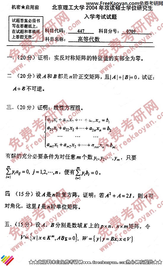 专业课考研经验 本站小编 FreeKaoyan 2018-01-22北京理工大学2003年考研真题-高等代数