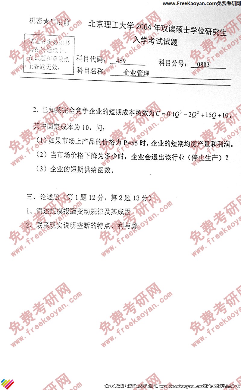 专业课考研经验 本站小编 FreeKaoyan 2018-01-22北京理工大学2003年考研真题-经济学基础