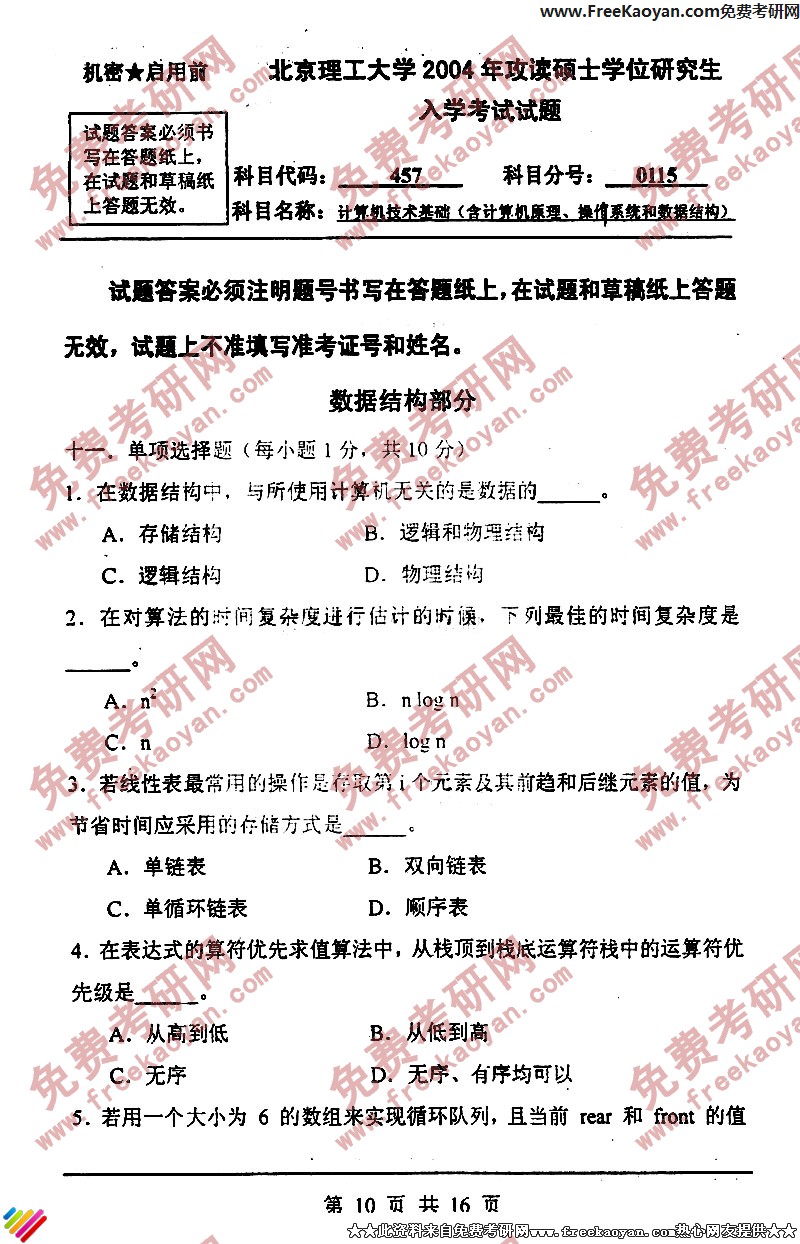 北京理工大学2004年考研真题-计算机技术基础(含计算机组成原理、操作系统和数据结构)(10)