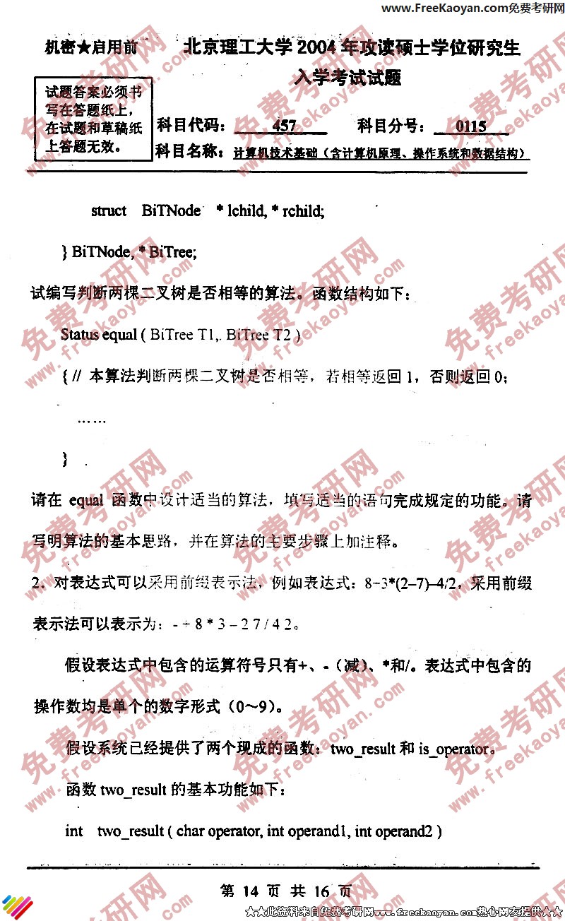 北京理工大学2004年考研真题-计算机技术基础(含计算机组成原理、操作系统和数据结构)(14)