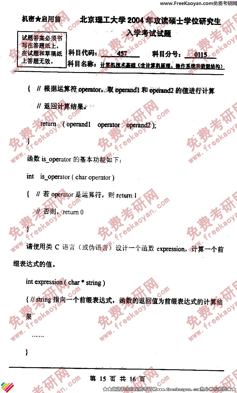 北京理工大学2004年考研真题-计算机技术基础(含计算机组成原理、操作系统和数据结构)(15)