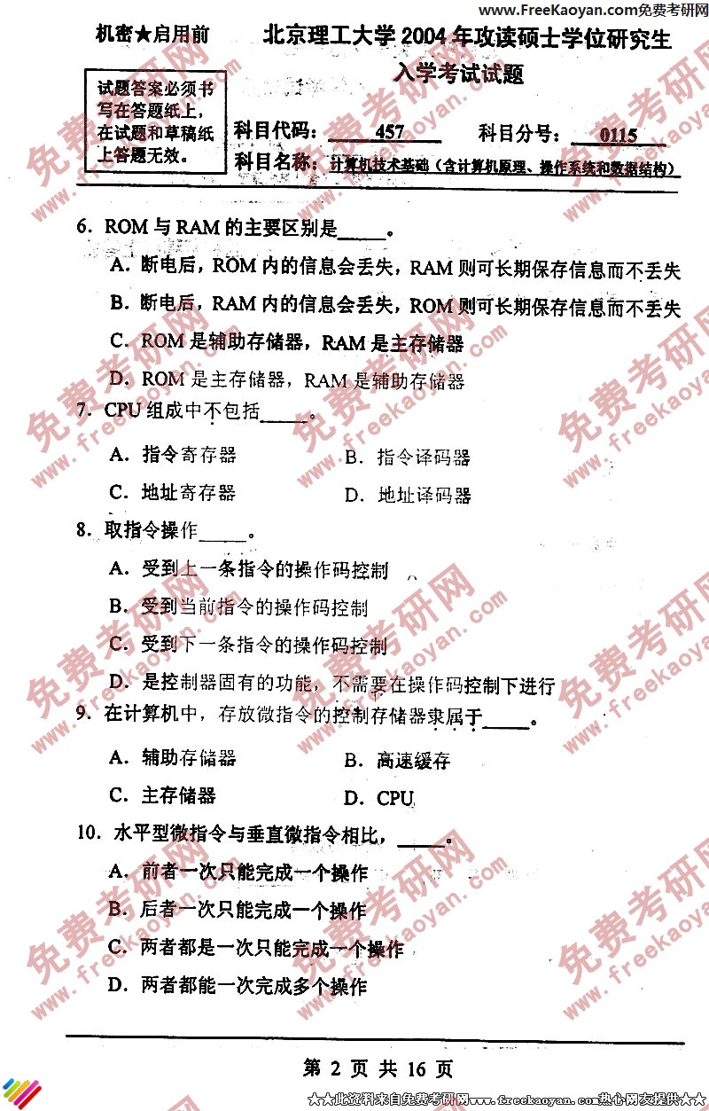 北京理工大学2004年考研真题-计算机技术基础(含计算机组成原理、操作系统和数据结构)(2)