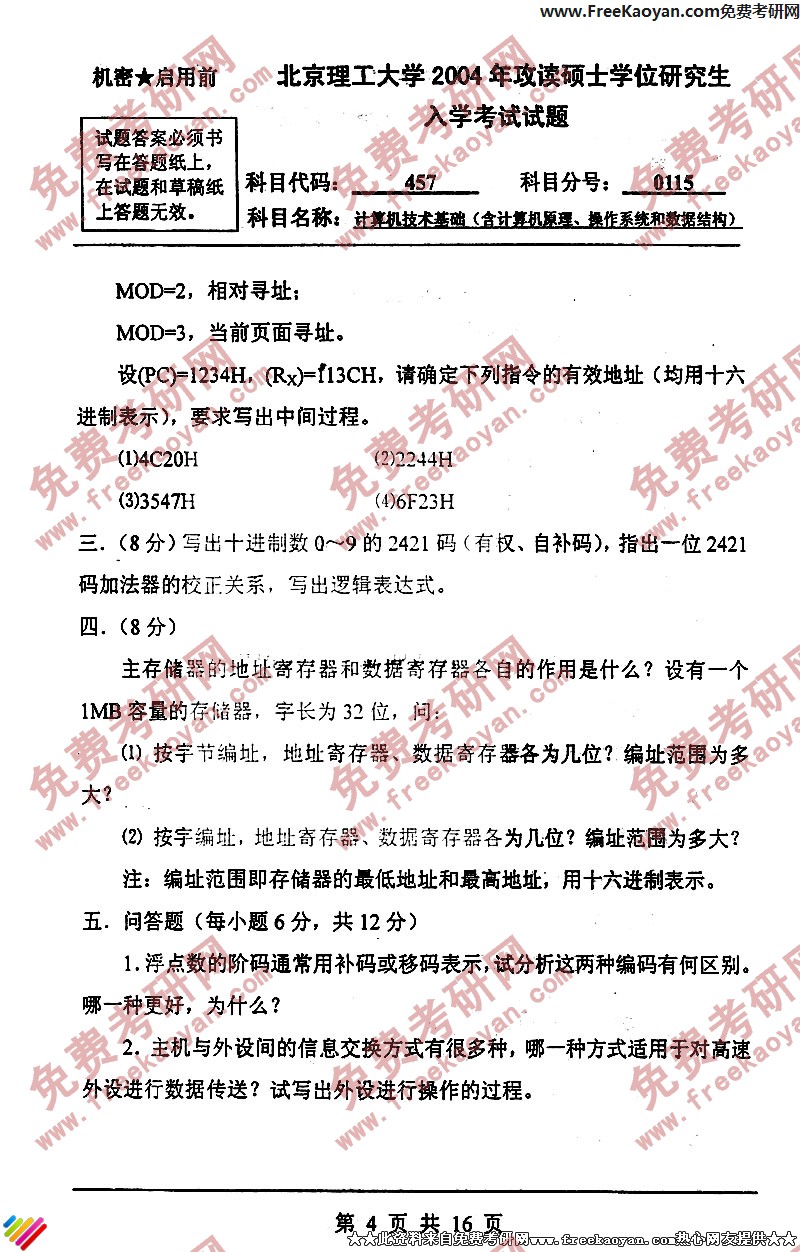 北京理工大学2004年考研真题-计算机技术基础(含计算机组成原理、操作系统和数据结构)(4)