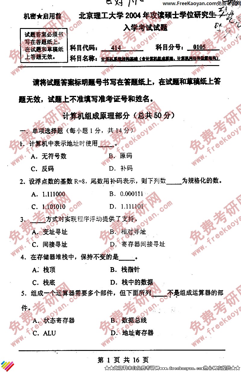 北京理工大学2004年考研真题-计算机技术基础(含计算机组成原理、操作系统和数据结构)