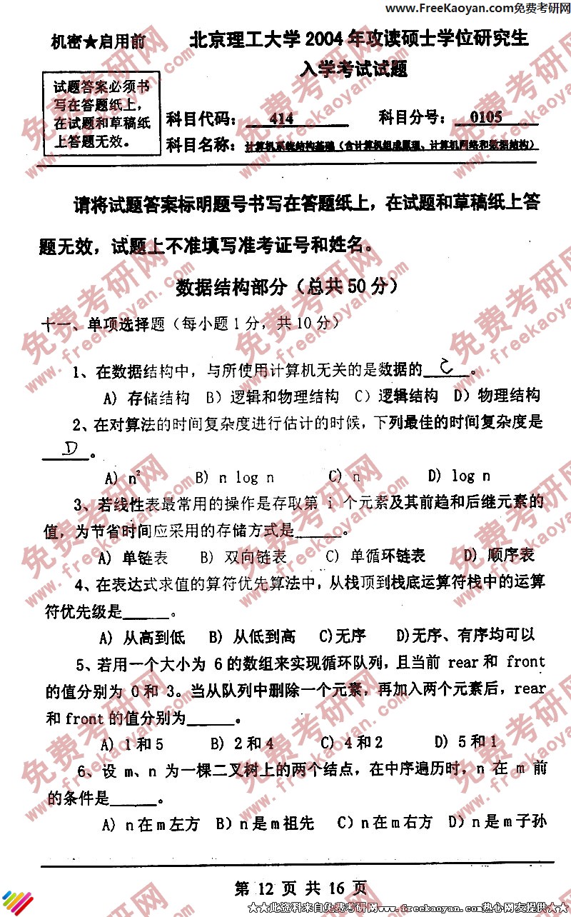 北京理工大学2004年考研真题-计算机技术基础(含计算机组成原理、操作系统和数据结构)