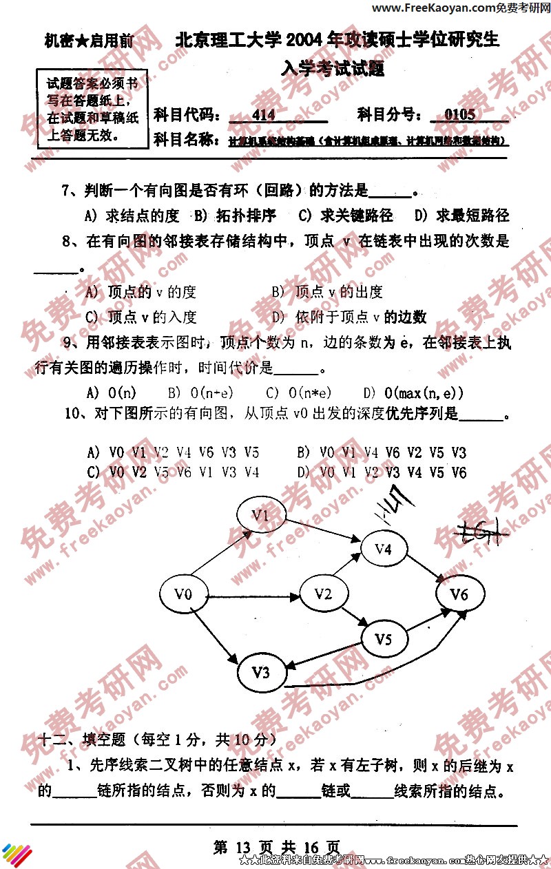 专业课考研经验 本站小编 FreeKaoyan 2018-01-22北京理工大学2003年考研真题-计算机技术基础(含计算机组成原理、操作系统和数据结构)