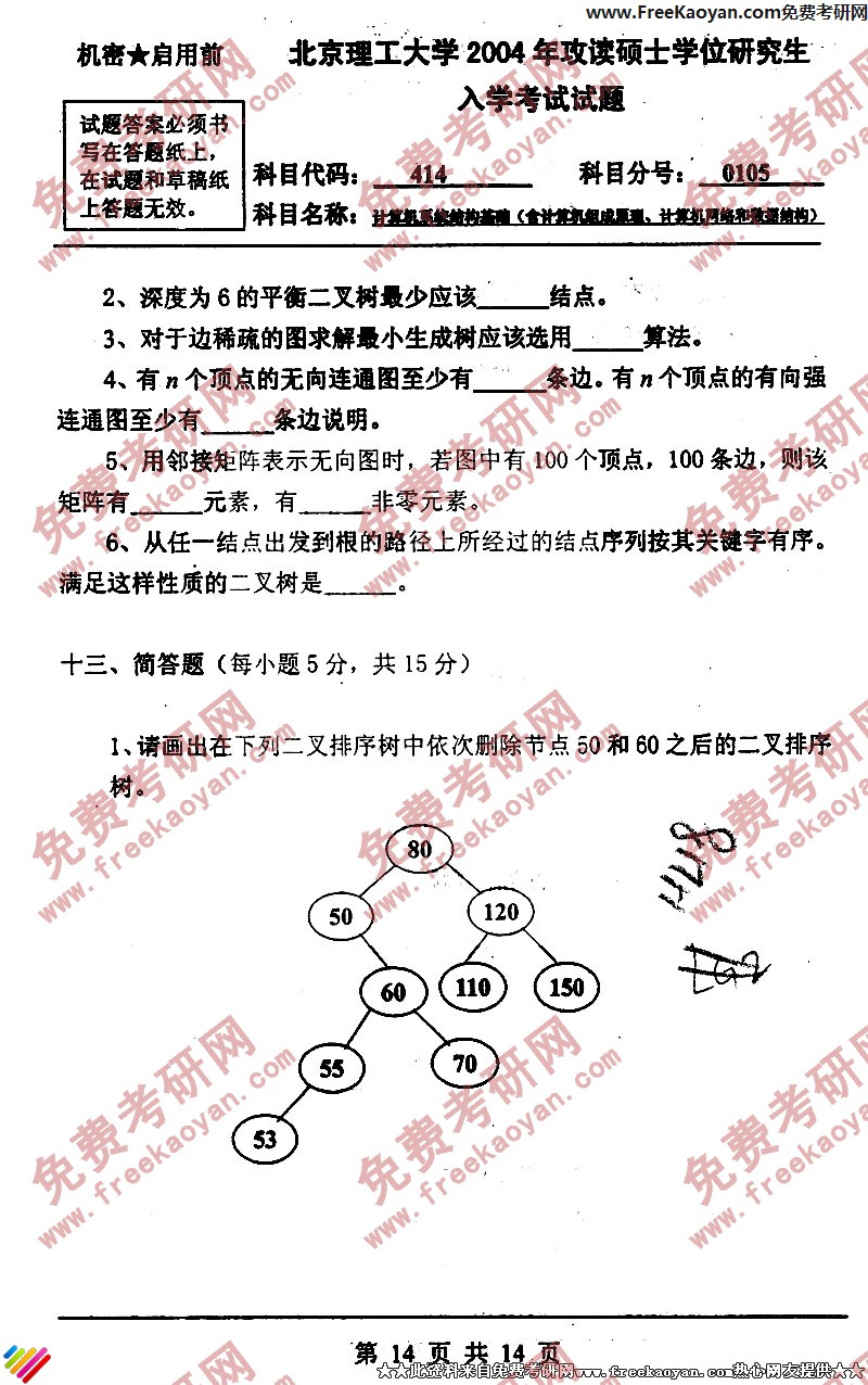 北京理工大学2004年考研真题-计算机技术基础(含计算机组成原理、操作系统和数据结构)