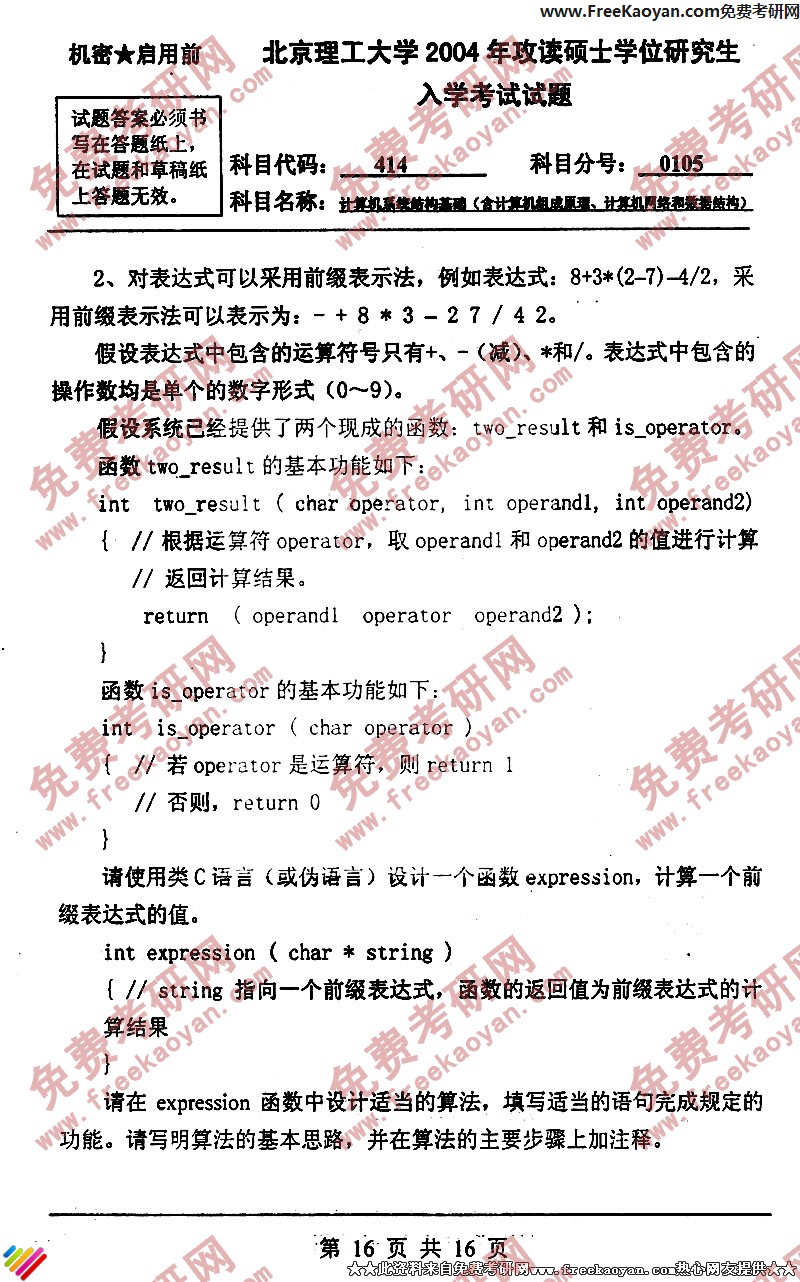 北京理工大学2004年考研真题-计算机技术基础(含计算机组成原理、操作系统和数据结构)