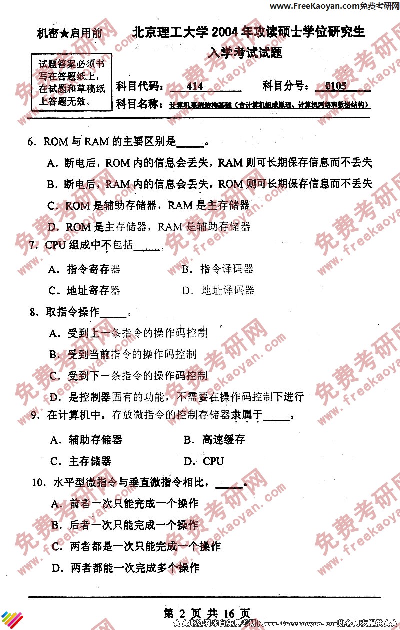北京理工大学2004年考研真题-计算机技术基础(含计算机组成原理、操作系统和数据结构)