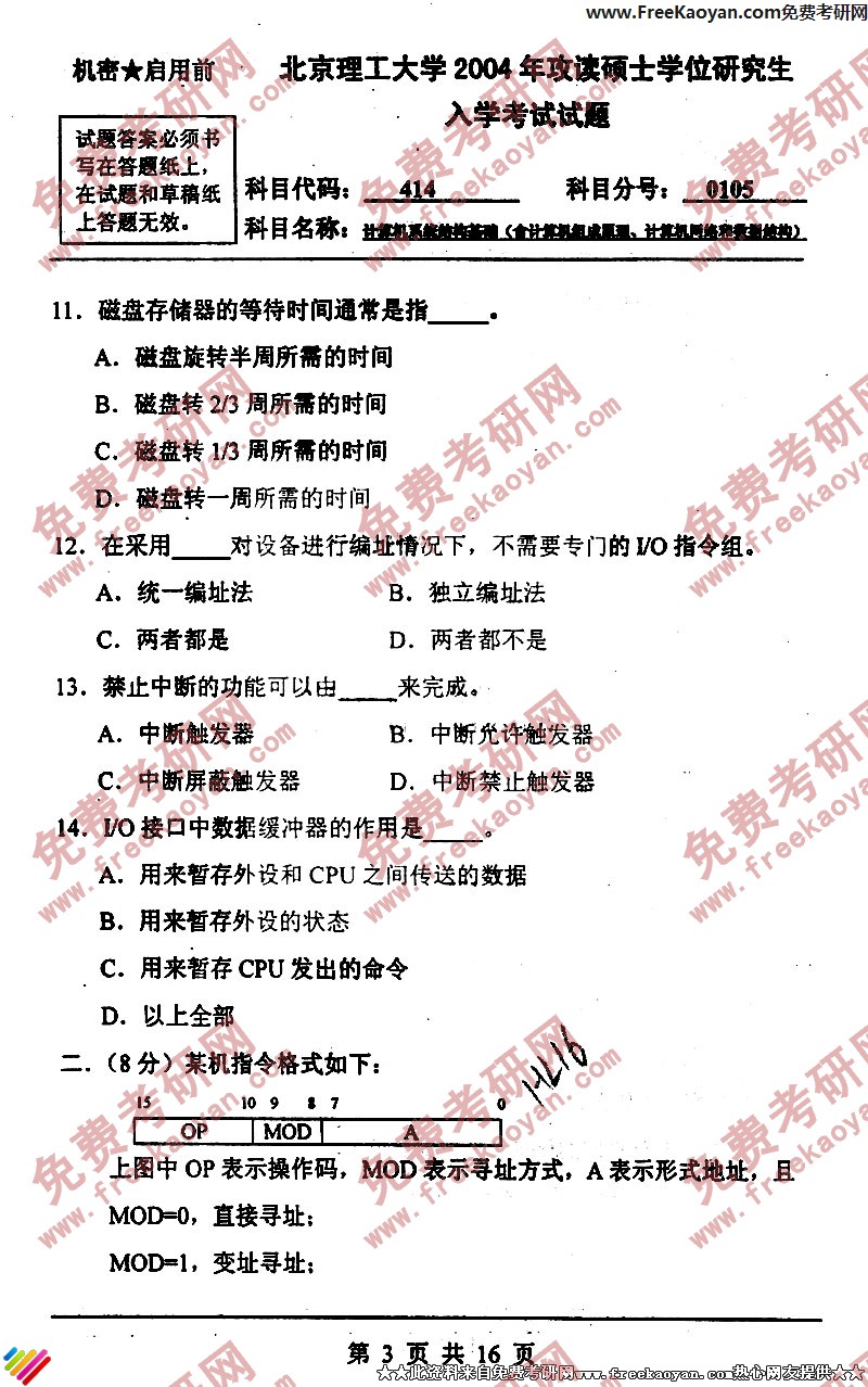 北京理工大学2004年考研真题-计算机技术基础(含计算机组成原理、操作系统和数据结构)