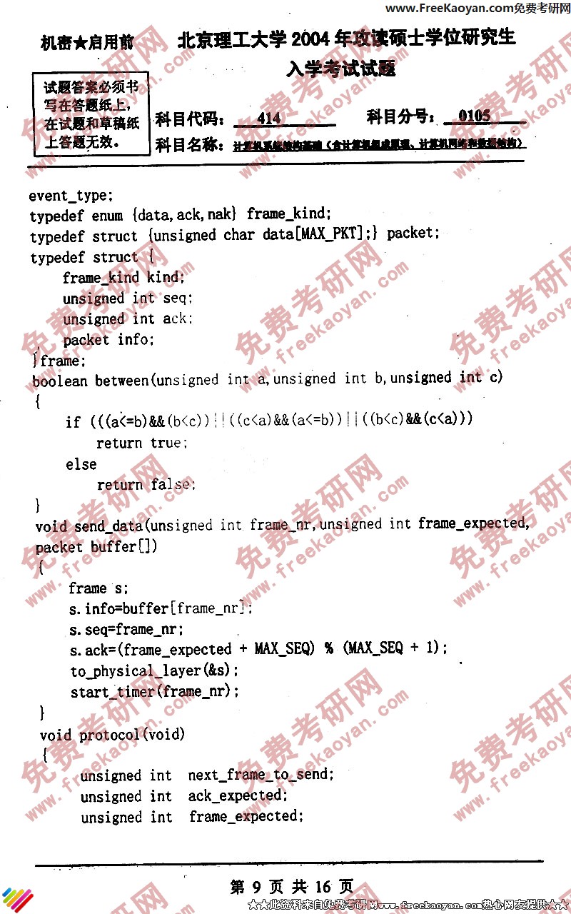 北京理工大学2004年考研真题-计算机技术基础(含计算机组成原理、操作系统和数据结构)