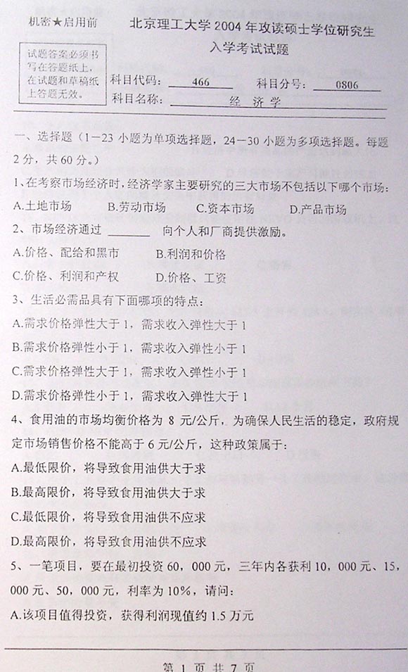 北京理工大学2004年考研真题-经济学基础