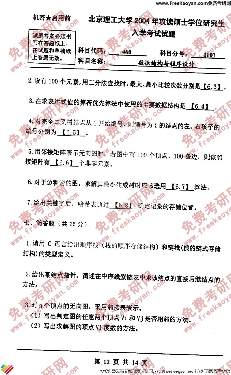 北京理工大学2004年考研真题-数据结构与程序设计(12)