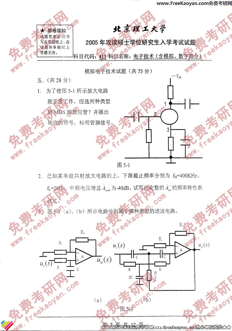 北京理工大学2005年考研真题-电子力学(含模拟、数字部分)(7)