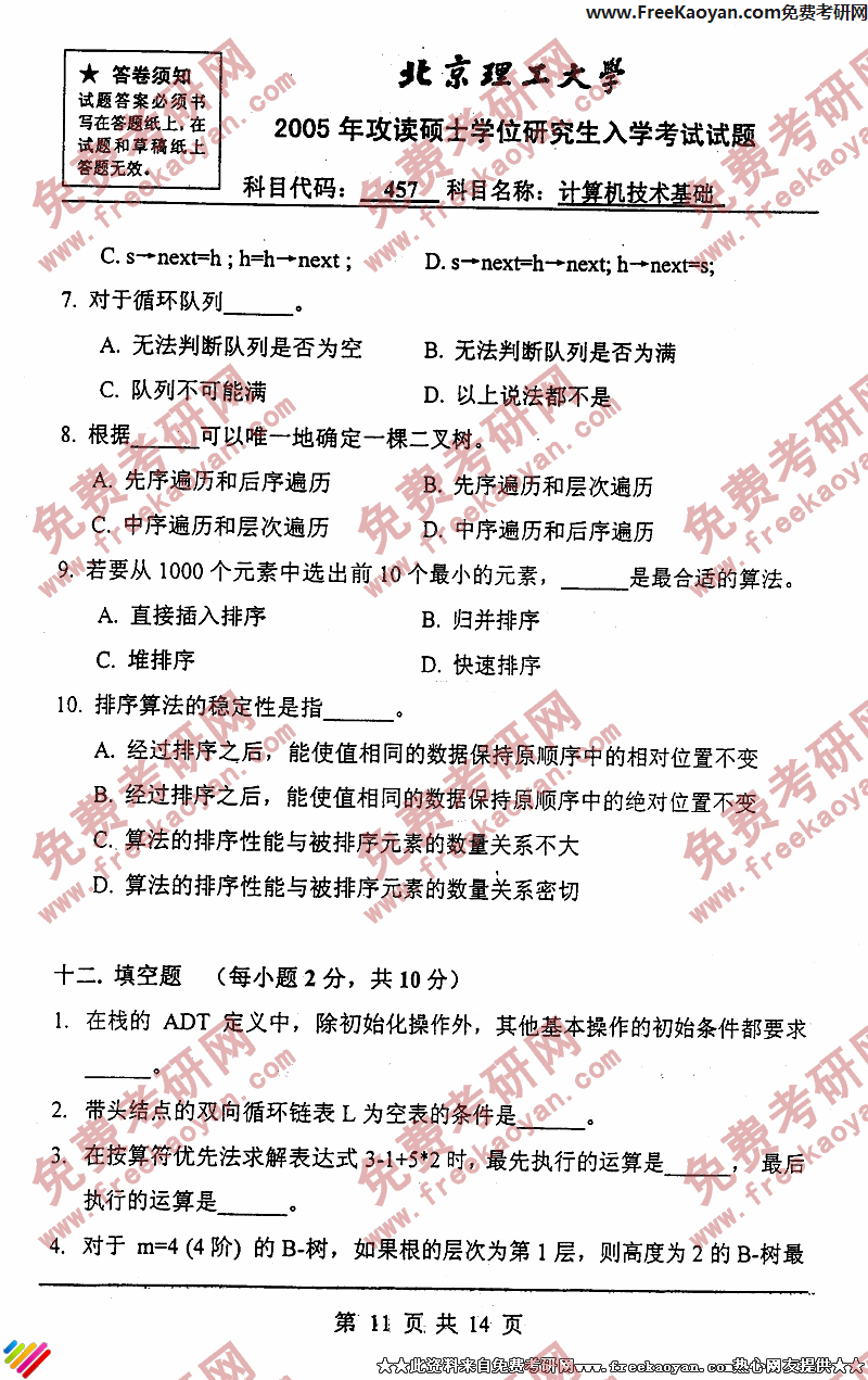 北京理工大学2005年考研真题-计算机技术基础(含计算机组成原理、操作系统和数据结构)(11)