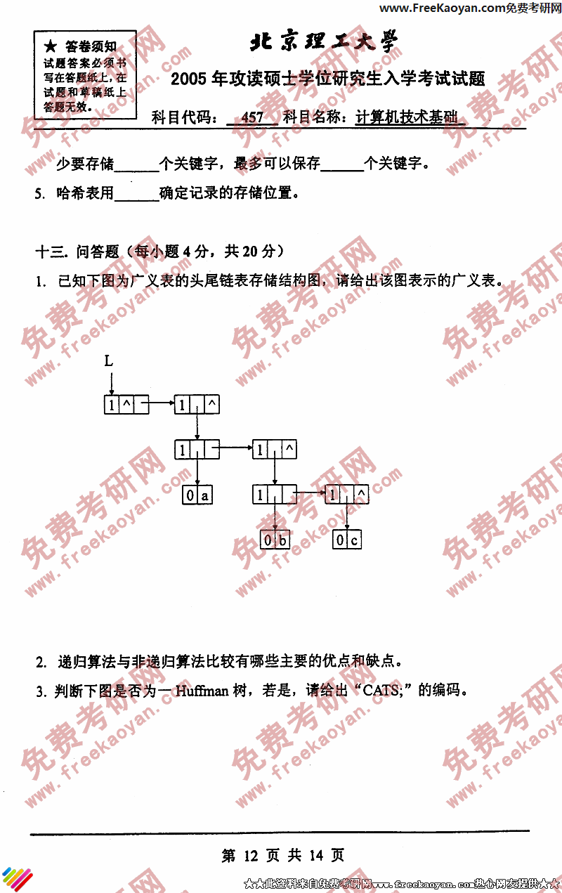 北京理工大学2005年考研真题-计算机技术基础(含计算机组成原理、操作系统和数据结构)(12)