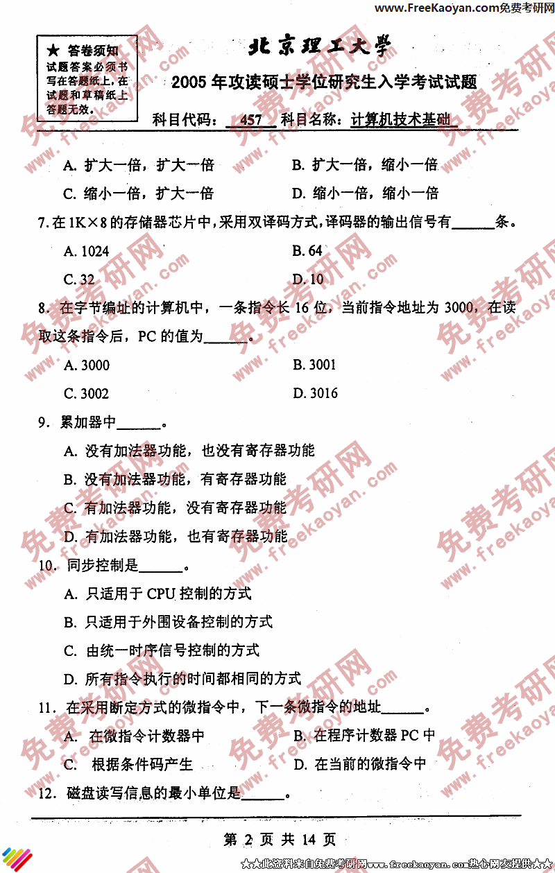 北京理工大学2005年考研真题-计算机技术基础(含计算机组成原理、操作系统和数据结构)(2)