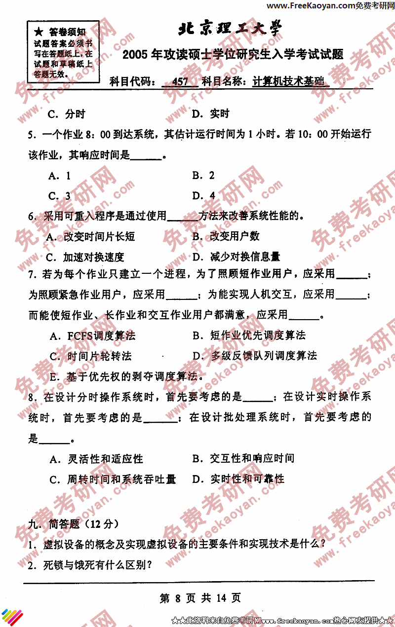 北京理工大学2005年考研真题-计算机技术基础(含计算机组成原理、操作系统和数据结构)(8)