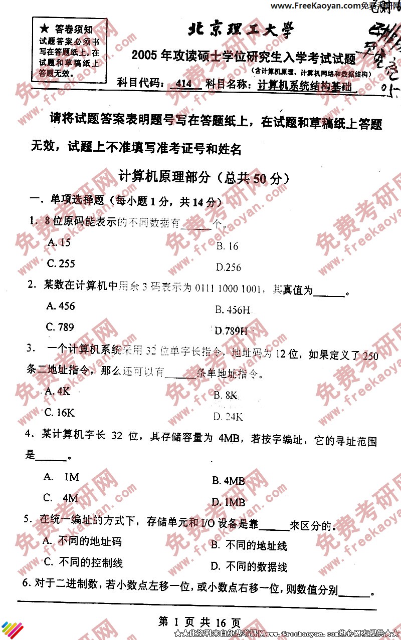 专业课考研经验 本站小编 FreeKaoyan 2018-01-22北京理工大学2005年考研真题-计算机技术基础(含计算机组成原理、操作系统和数据结构)