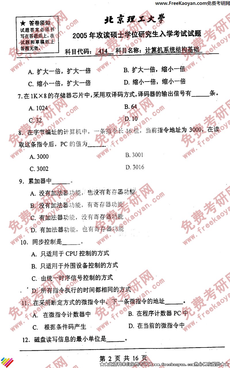 专业课考研经验 本站小编 FreeKaoyan 2018-01-22北京理工大学2005年考研真题-计算机技术基础(含计算机组成原理、操作系统和数据结构)