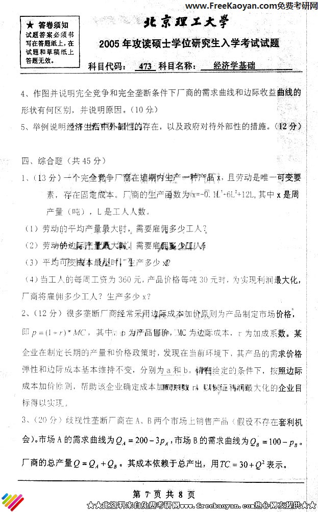 北京理工大学2005年考研真题-经济学基础(7)