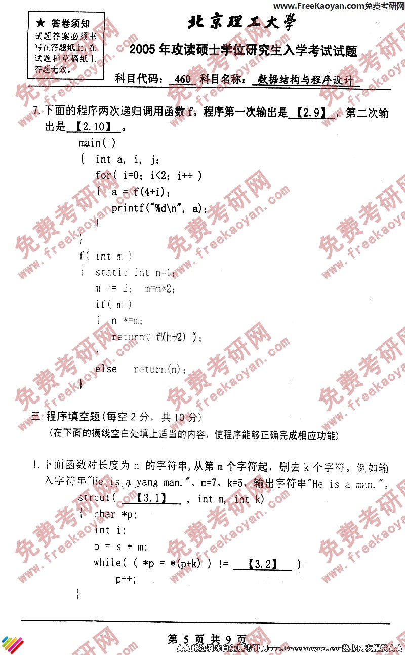 北京理工大学2005年考研真题-数据结构与程序设计(5)