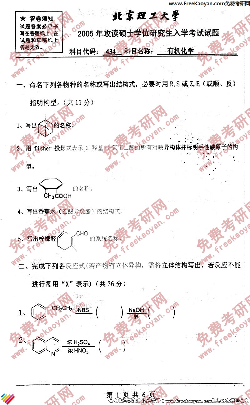 北京理工大学2005年考研真题-有机化学