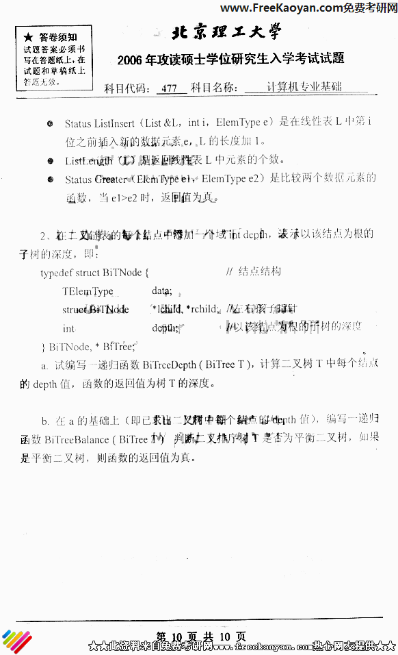 专业课考研经验 本站小编 FreeKaoyan 2018-01-22北京理工大学2005年考研真题-数据结构与程序设计