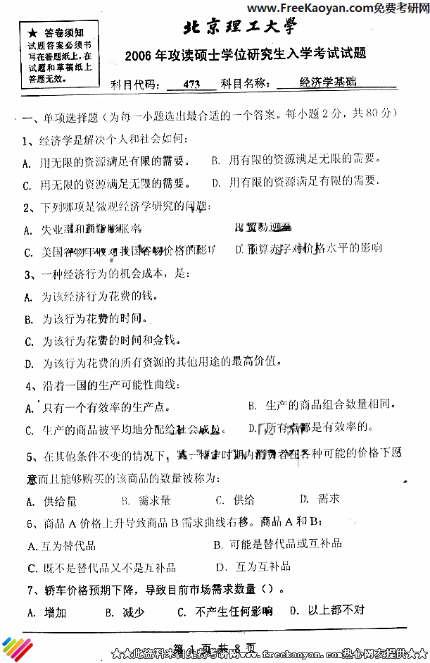北京理工大学2006年考研真题-经济学基础